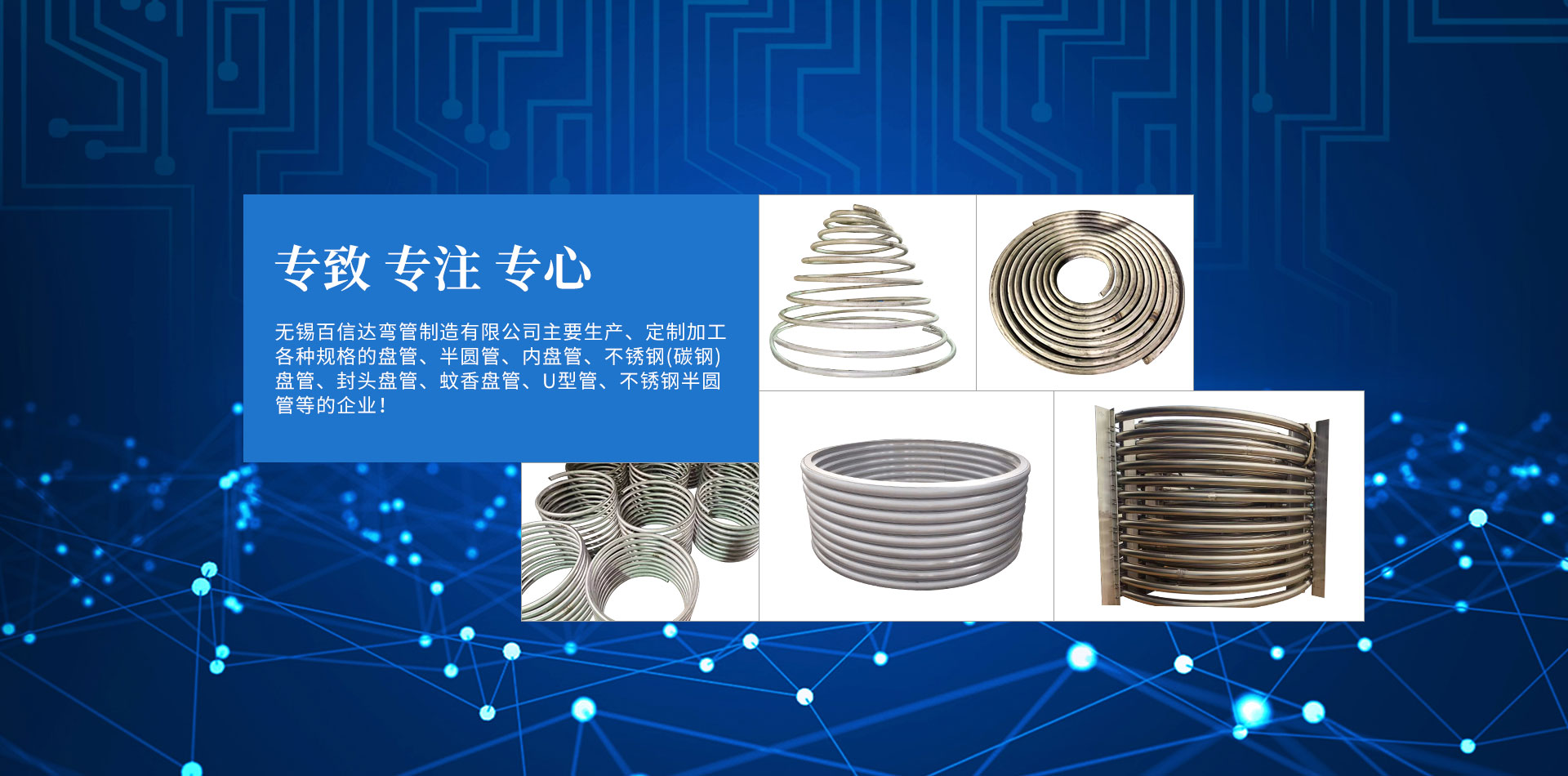 無錫百信達(dá)彎管制造有限公司位于經(jīng)濟(jì)發(fā)達(dá)、風(fēng)景秀麗的太湖之濱。本公司擁有完整、科學(xué)的質(zhì)量管理體系,公司的誠信、實(shí)力和產(chǎn)品質(zhì)量獲得業(yè)界的認(rèn)可。公司專注生產(chǎn)、定制加工各種規(guī)格的盤管、半圓管、內(nèi)盤管、不銹鋼盤管、封頭盤管、蚊香盤管、U型管、不銹鋼半圓管、碳鋼盤管等的企業(yè)。本公司設(shè)計(jì)加工的彎管設(shè)備,質(zhì)量精良、結(jié)構(gòu)合理,效率高、操作簡易、經(jīng)久耐用。公司已經(jīng)承接了各地多個大型場館工程項(xiàng)目的彎管加工,屢次得到了多家大客戶的好評。努力滿足客戶的需要,不斷提高自身水平是公司追求的目標(biāo)。歡迎社會各界朋友蒞臨無錫百信達(dá)彎管制造有限公司參觀、指導(dǎo)和業(yè)務(wù)洽談!